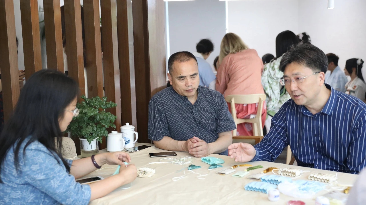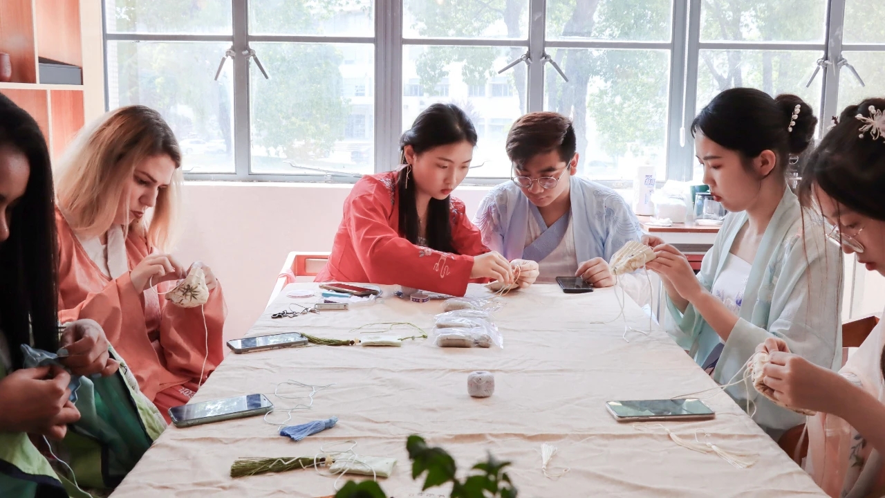 茶艺表演结束后,同学们来到了制作香囊的区域,这里早已布置好布面材料和香料等用具。一进入座位,同学们便拿起了各自面前的材料,穿针引线,跃跃欲试。不少同学在制作过程中遇到了困难,他们互相讨论寻找香囊的制作方法。